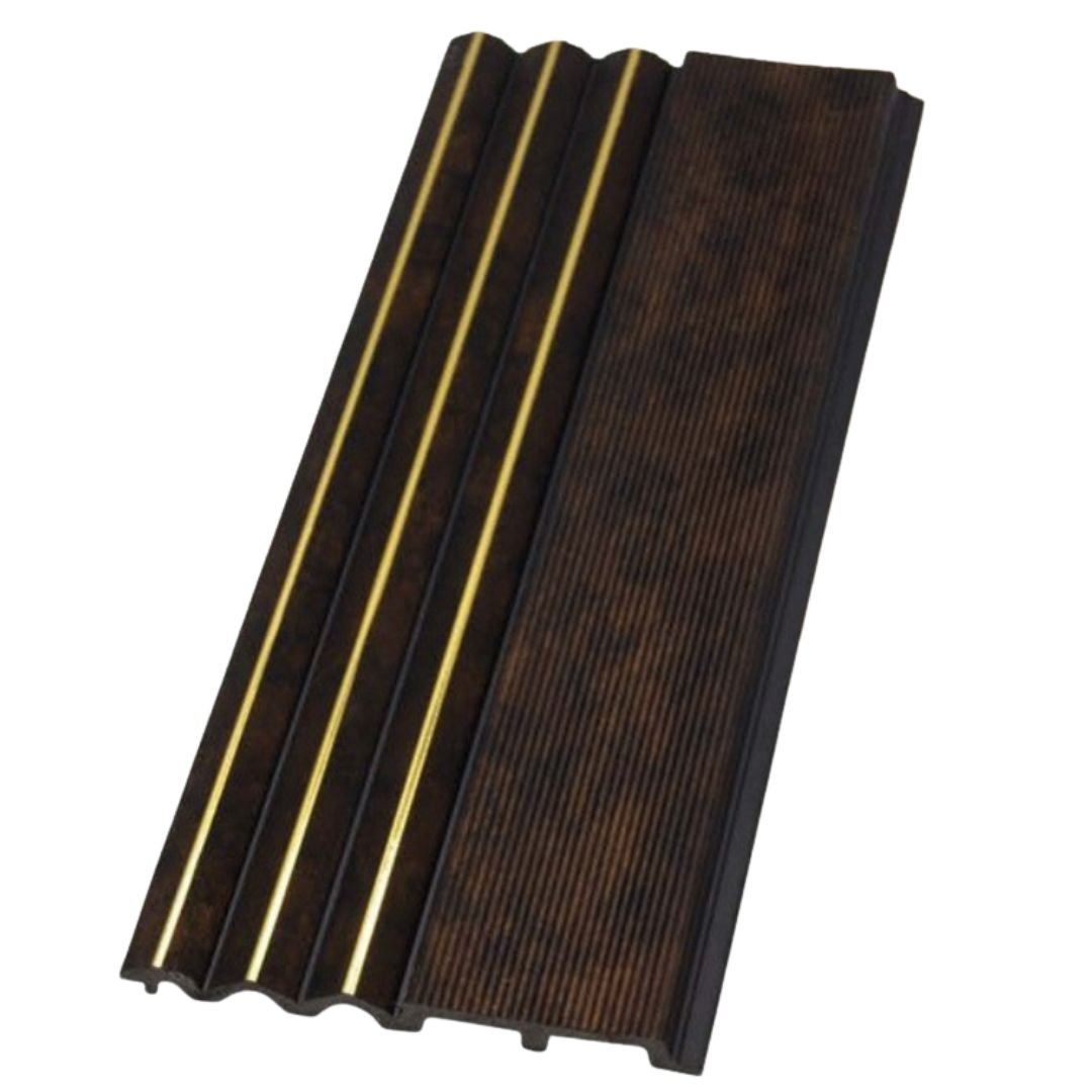 Give your interiors a rich and royal appearance with the Royal Walnut Gold Strip Charcoal Panel. Crafted with a deep walnut brown wood texture and enhanced with sleek gold strip detailing, this panel creates a striking vertical fluted design that adds instant luxury to any wall.