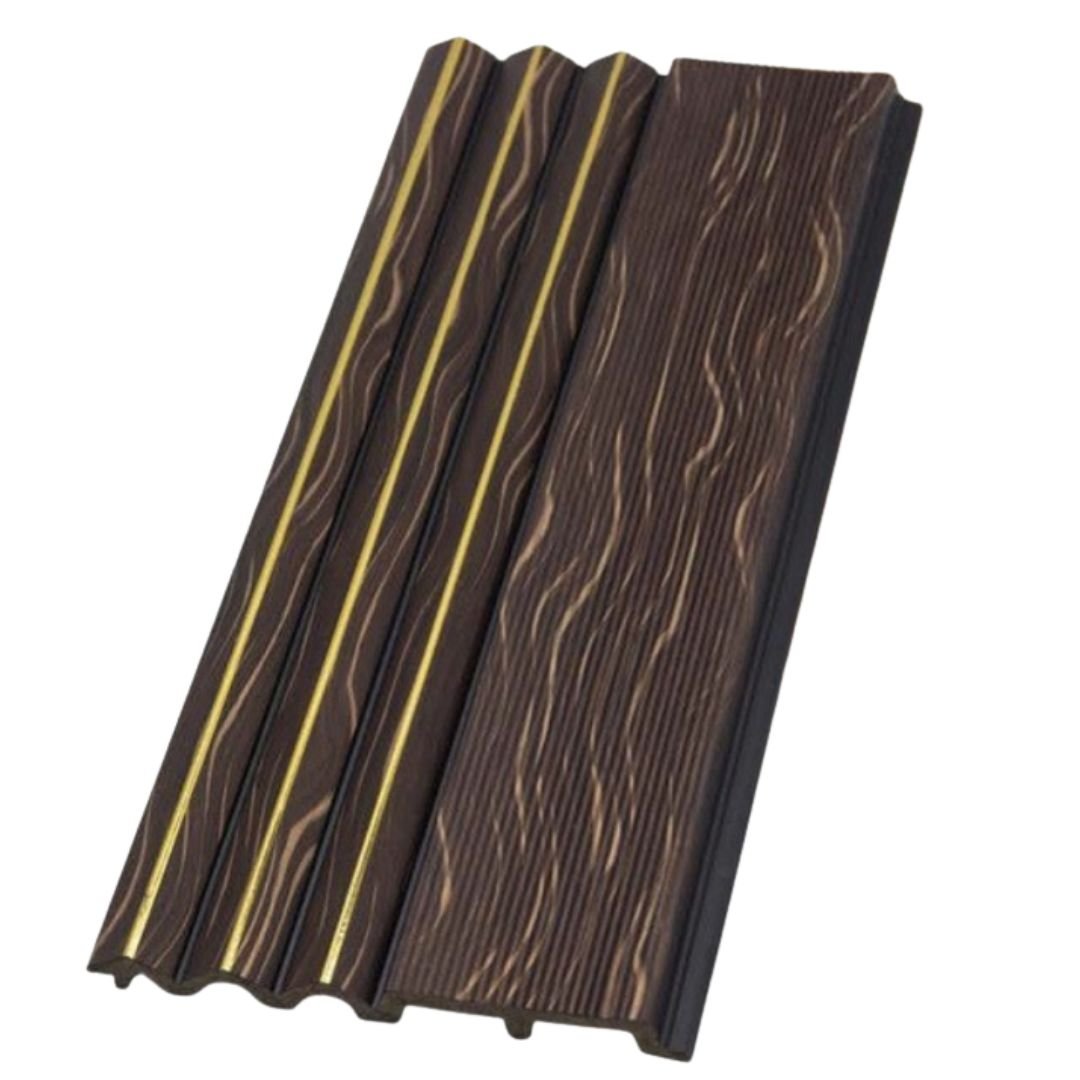 Add warmth and luxury to your interiors with the Walnut Gold Wave Charcoal Panel. Featuring a rich dark walnut wood texture combined with elegant gold wave inlay strips, this panel delivers a bold and premium wall design.